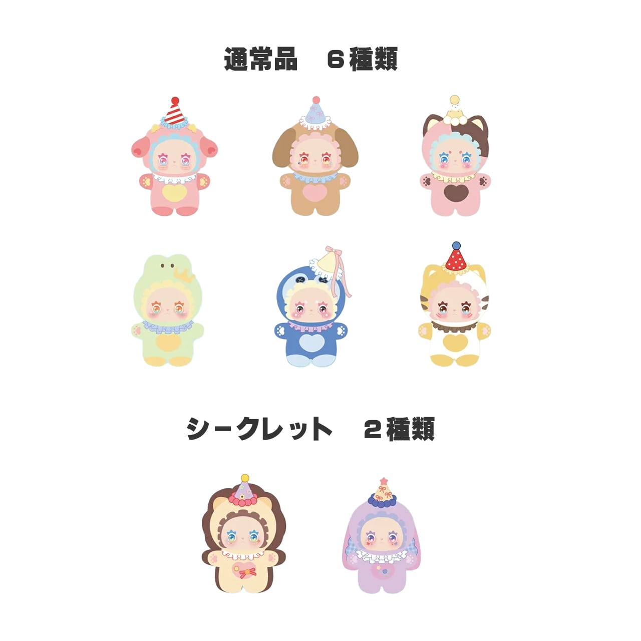 〇ブラインドボックスには、標準6種類+シークレット2種類の合計8種類が揃っています。シークレットは一定の割合で1セットの中に封入されていますので、1セットで購入いただいても手に入らない場合がございますので、ご了承ください。