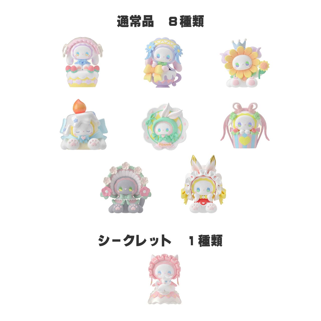〇ブラインドボックスは通常品8種類に加え、シークレット1種類を含む合計9種類で構成されています。シークレットは特定の割合で封入されていますので、1セットの購入で必ず手に入るとは限りませんので、あらかじめご了承ください。